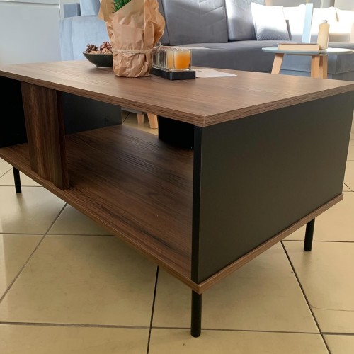 Kolekcja mebli skrzyniowych w odcieniu orzechowym z matowymi, czarnym wstawkami.