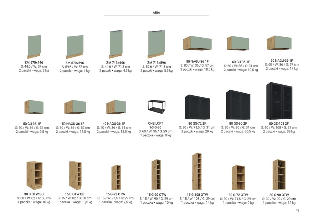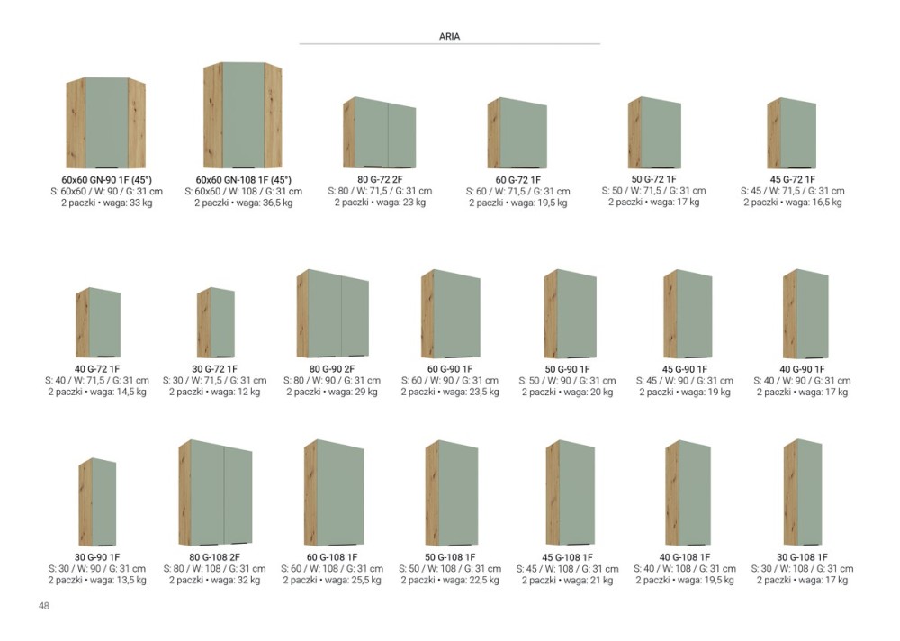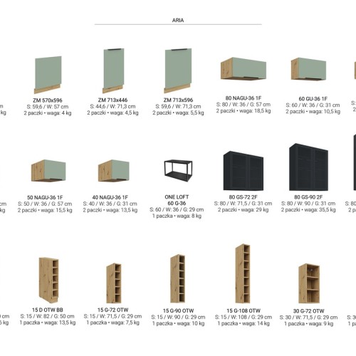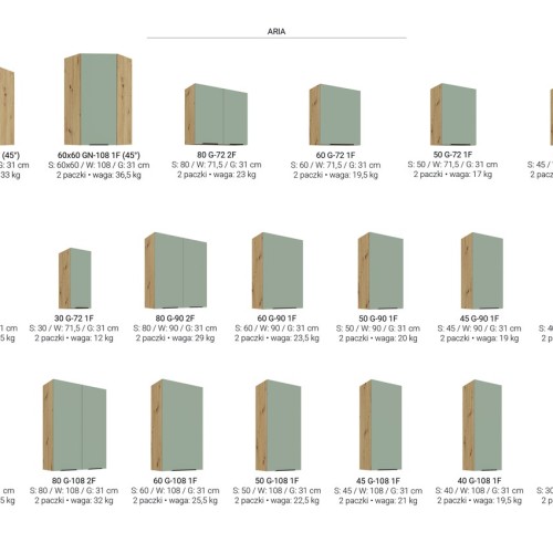 SYSTEM MODUŁOWY - do wyboru górne szafki w trzech wysokościach (72cm, 90cm i 108cm) oraz szafki dolne. Wykaz wszystkich szafek oraz ich wymiary dostępne w galerii zdjęć.