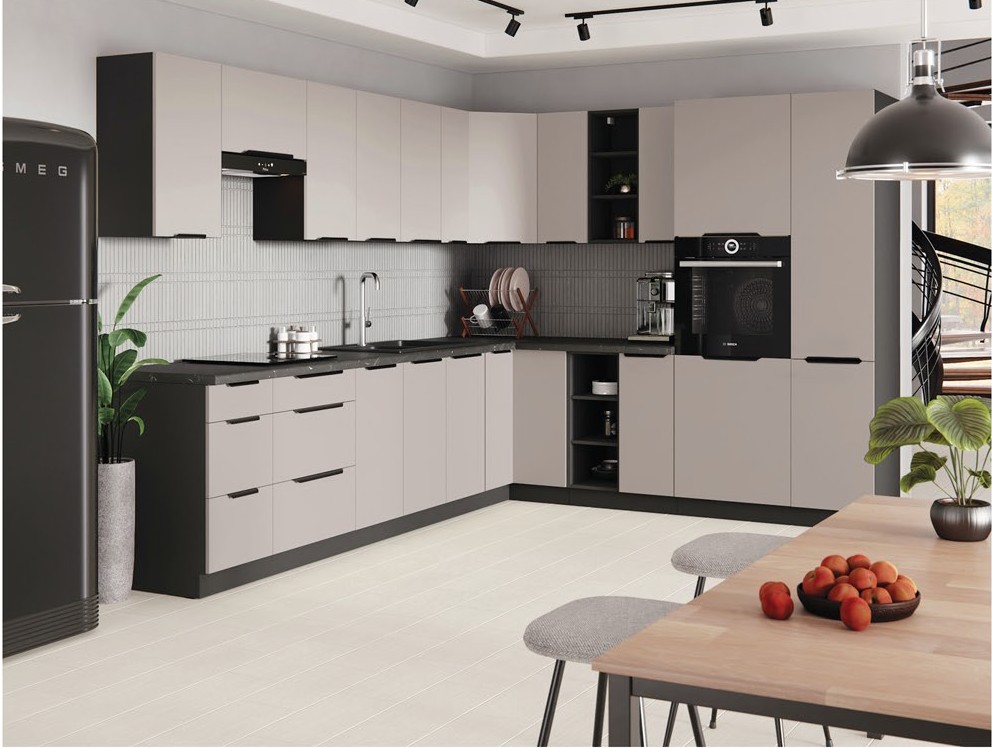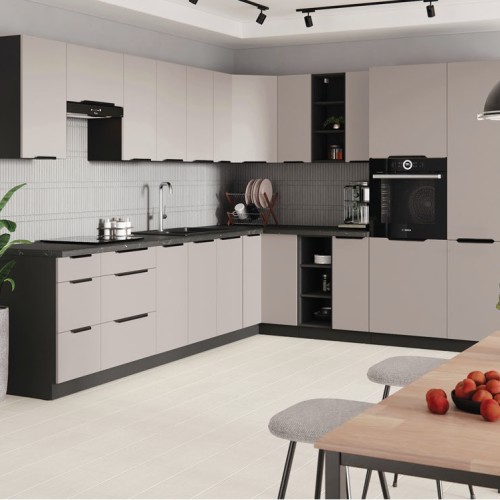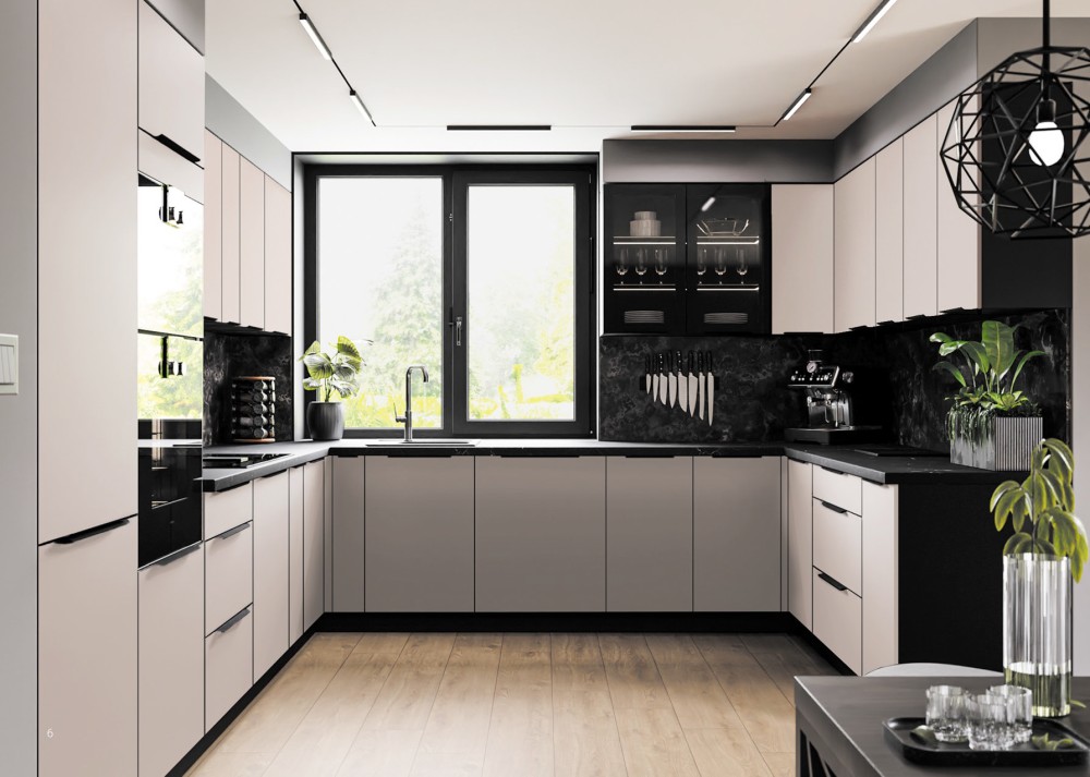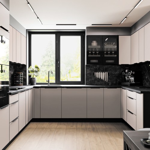 Fronty w kuchni ARONA są w kolorze kaszmiru a korpus w czerni. Uchwyt krawędziowy, metalowy - czarny mat.