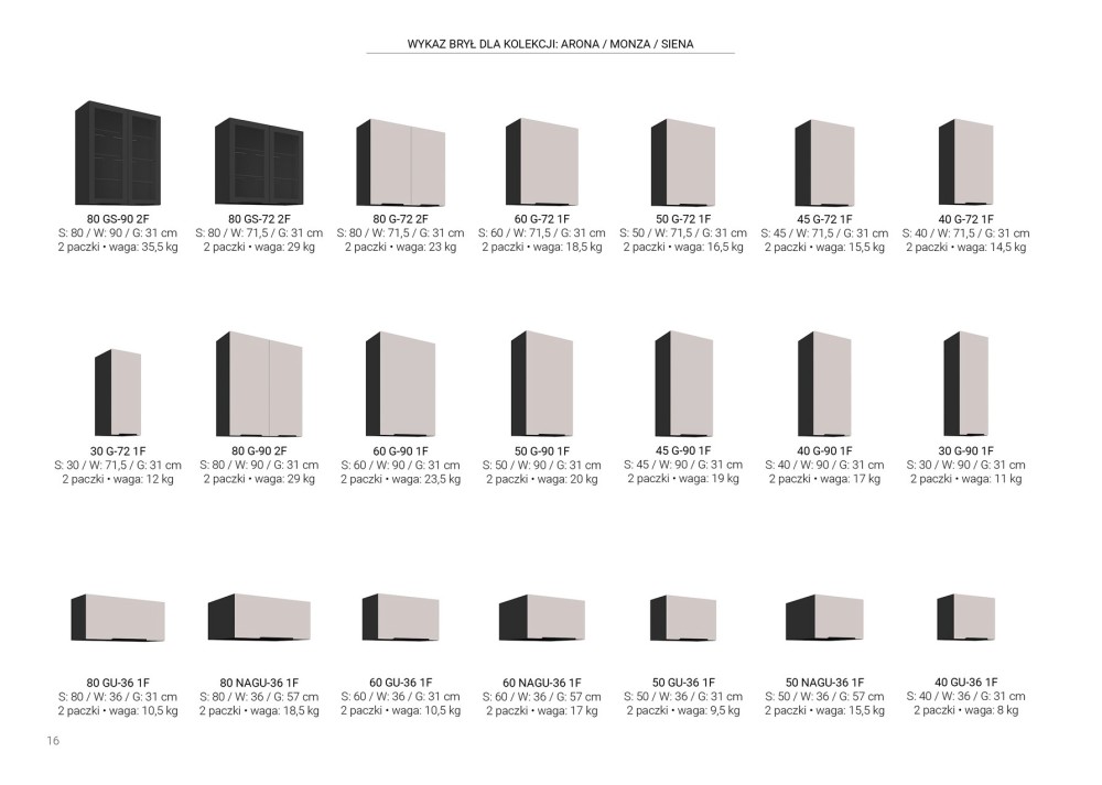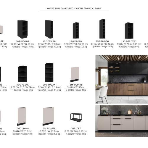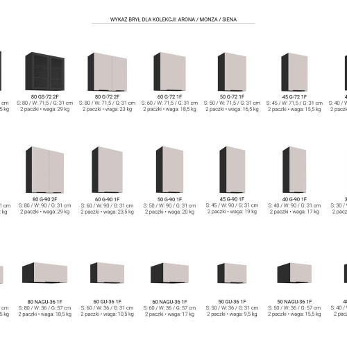 SYSTEM MODUŁOWY - do wyboru górne szafki w trzech wysokościach (72cm, 90cm i 108cm) oraz szafki dolne. Wykaz wszystkich szafek oraz ich wymiary dostępne w galerii zdjęć.