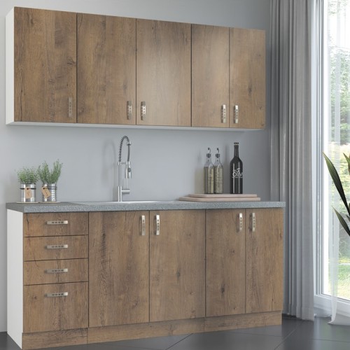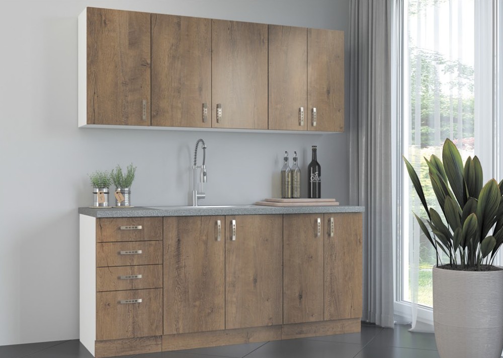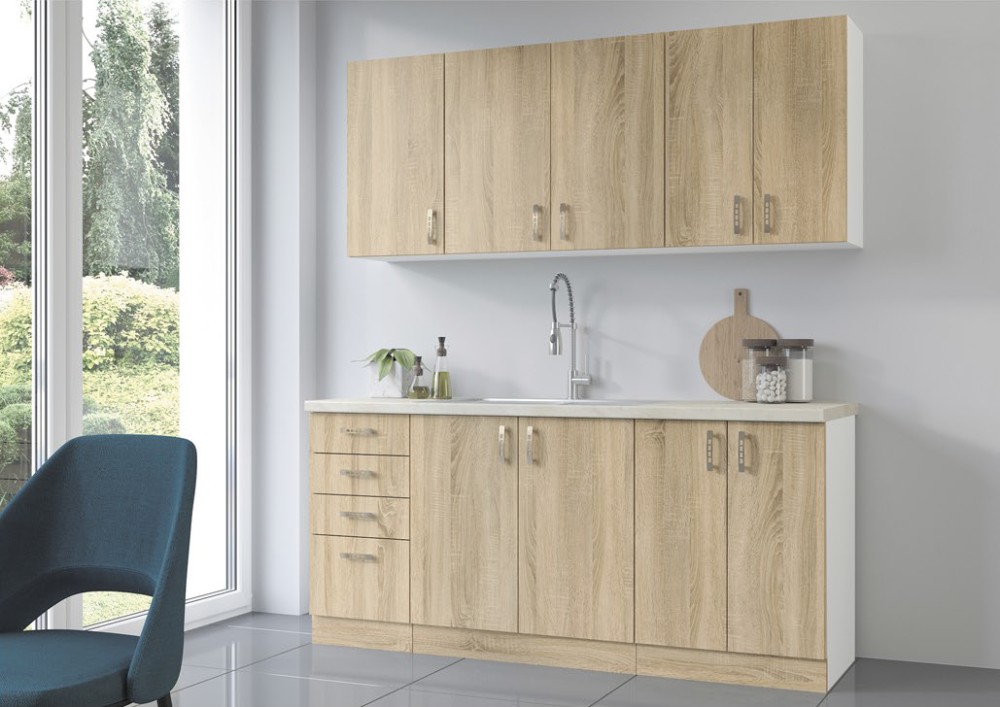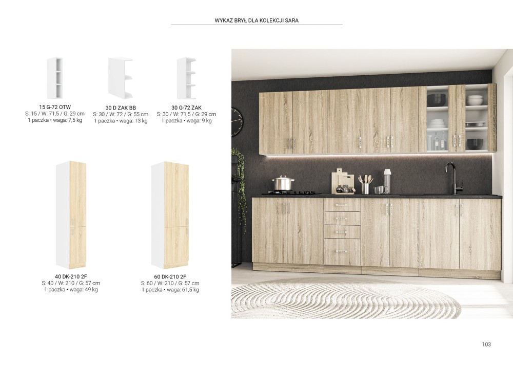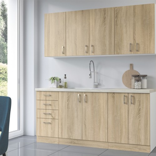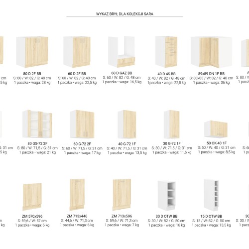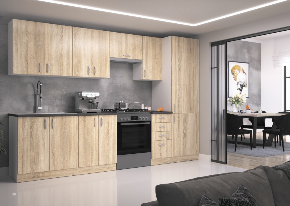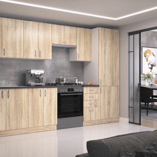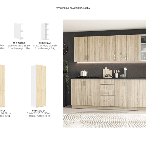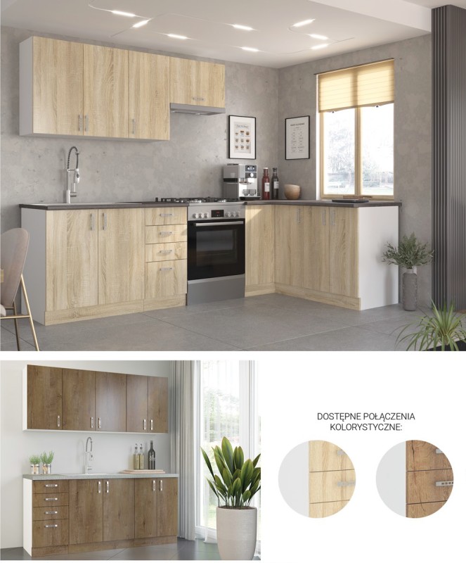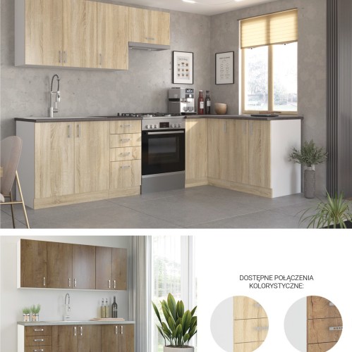 KUCHNIA SARA to połączenie nowoczesnej funkcjonalności z ciepłym, naturalnym wyglądem, dzięki eleganckim frontom w kolorze Dąb Sonoma lub Dąb Lefkas. Jasny biały korpus dodaje wnętrzu lekkości, a przemyślane rozmieszczenie szafek zapewnia wygodę i komfort codziennego użytkowania.
