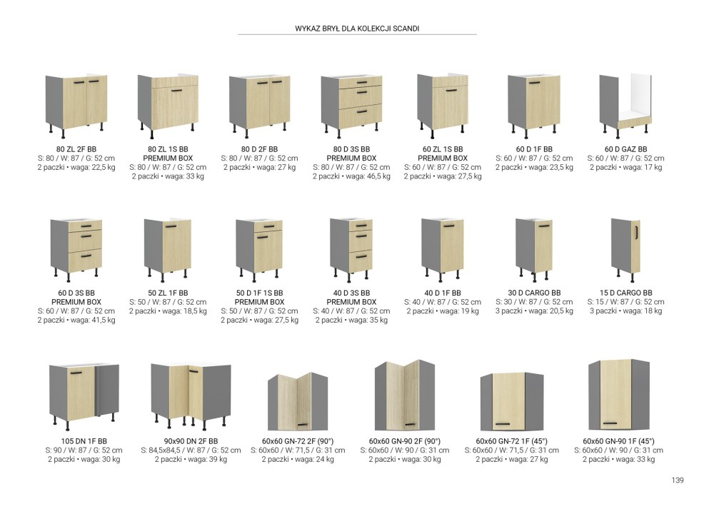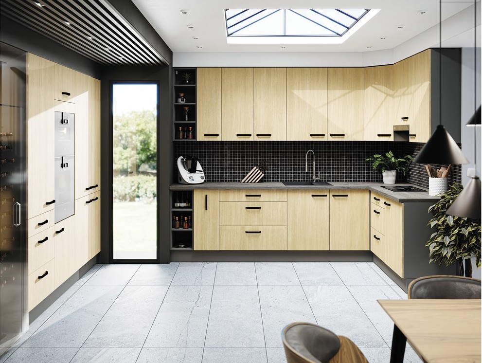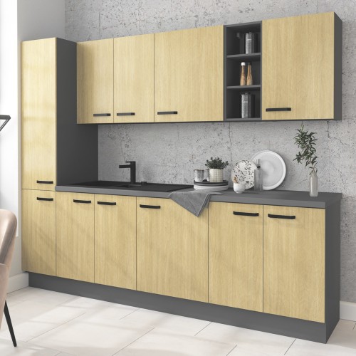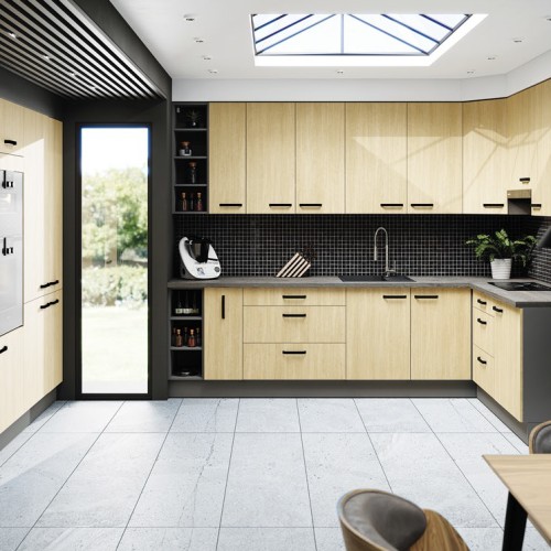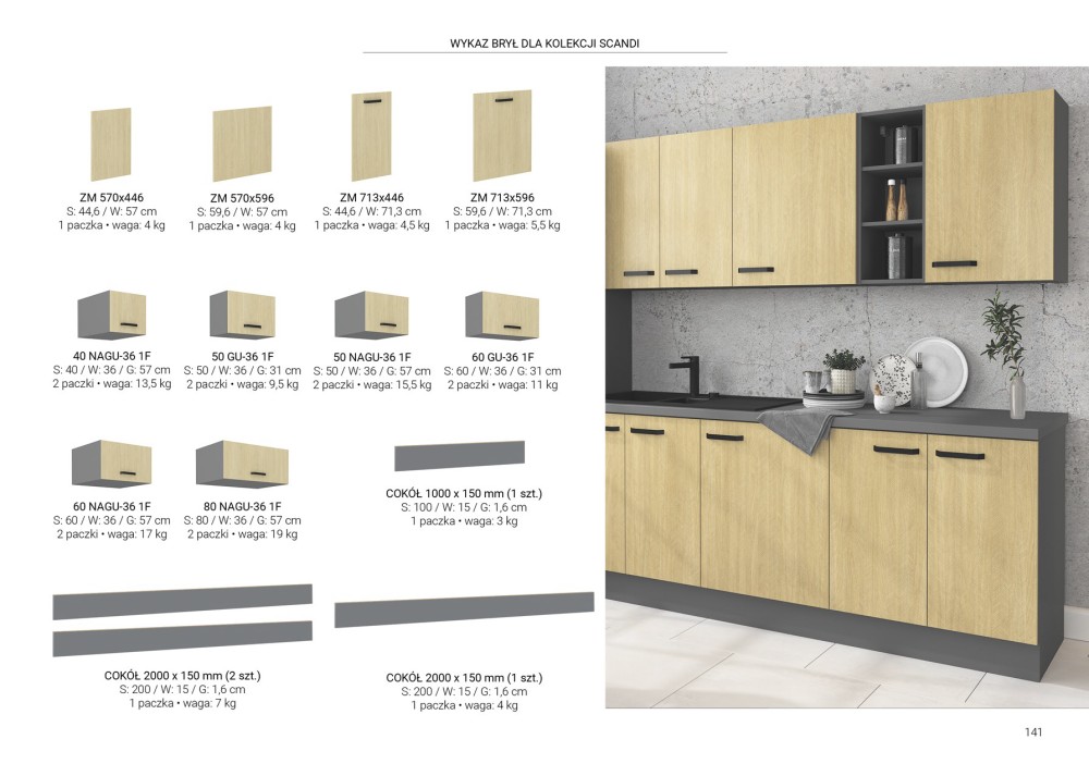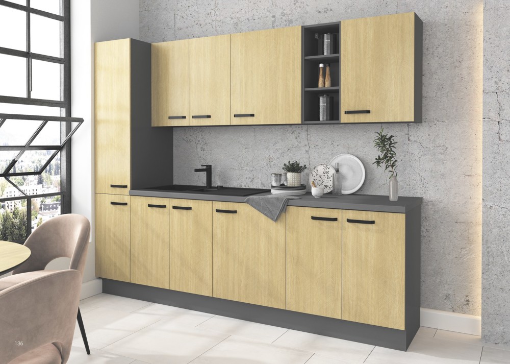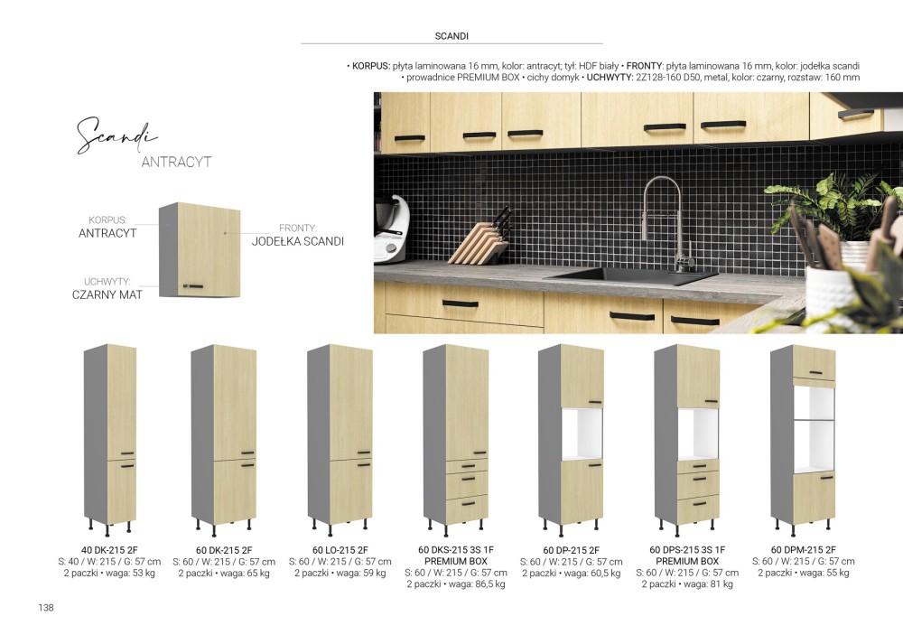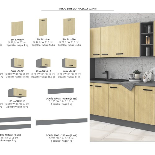 Meble kuchenne SCANDI w ciepłym, drewnianym wykończeniu tworzą przytulną i elegancką przestrzeń, idealnie komponując się z nowoczesnymi, czarnymi uchwytami. Przemyślany układ szafek i szuflad zapewnia funkcjonalność, sprawiając, że kuchnia jest zarówno