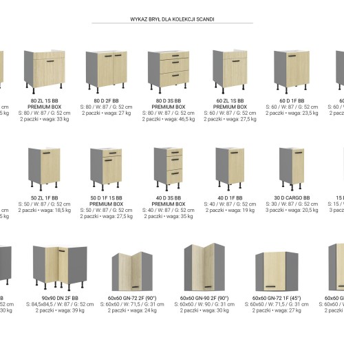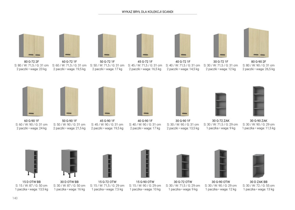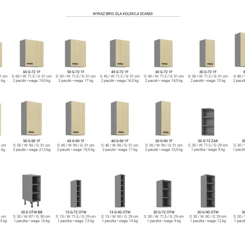 SYSTEM MODUŁOWY - do wyboru górne szafki w dwóch wysokościach (72cm i 90cm) oraz szafki dolne na regulowanych nóżkach. Wykaz wszystkich szafek oraz ich wymiary dostępne w galerii zdjęć. Korpus mebli występuje w kilku kolorach: biały, czarny i antracyt. Uchwyt metalowy - czarny mat.