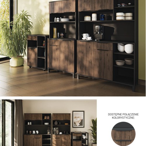 Fronty w BUFECIE ORAZ ROLLERZE MONZA są w kolorze orzecha okapi a korpus w czerni. Uchwyt krawędziowy, metalowy - czarny mat.