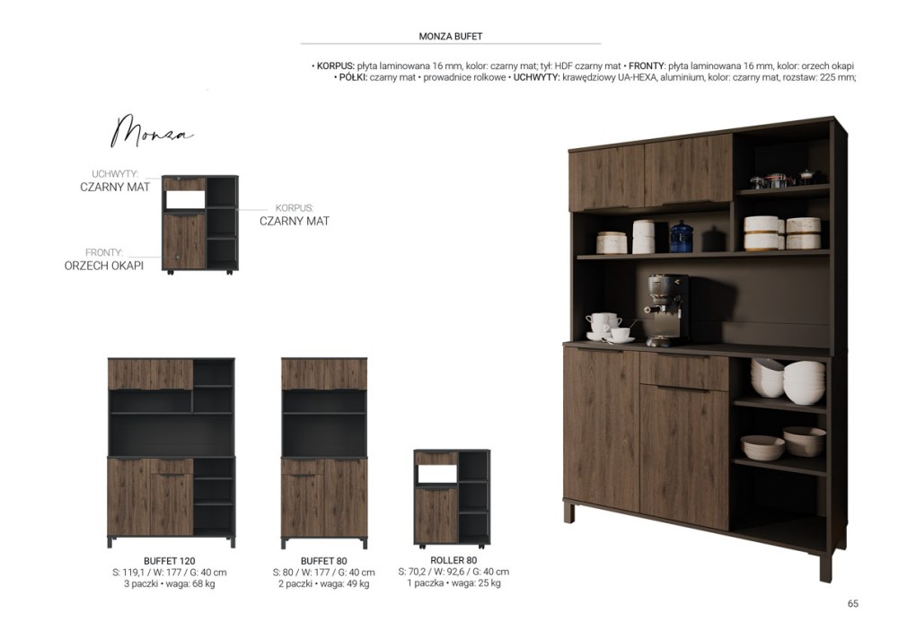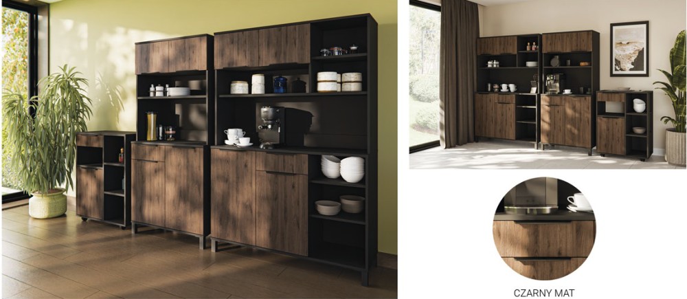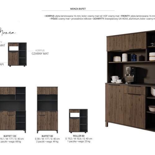 Kolekcja bufetów MONZA to eleganckie uzupełnienie modułowych mebli kuchennych, które łączy funkcjonalność z ponadczasowym stylem. Starannie dopracowane detale i harmonijne proporcje nadają wnętrzu wyjątkowy charakter, podkreślając ciepło i emocjonalny wymiar domowej przestrzeni. Bufet oraz Roller świetnie nadają się również do pomieszczeń socjalnych.