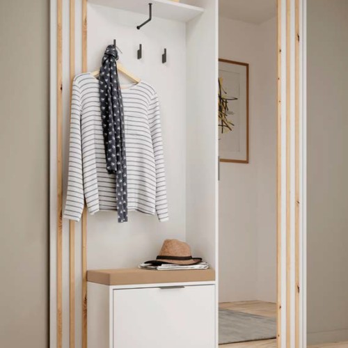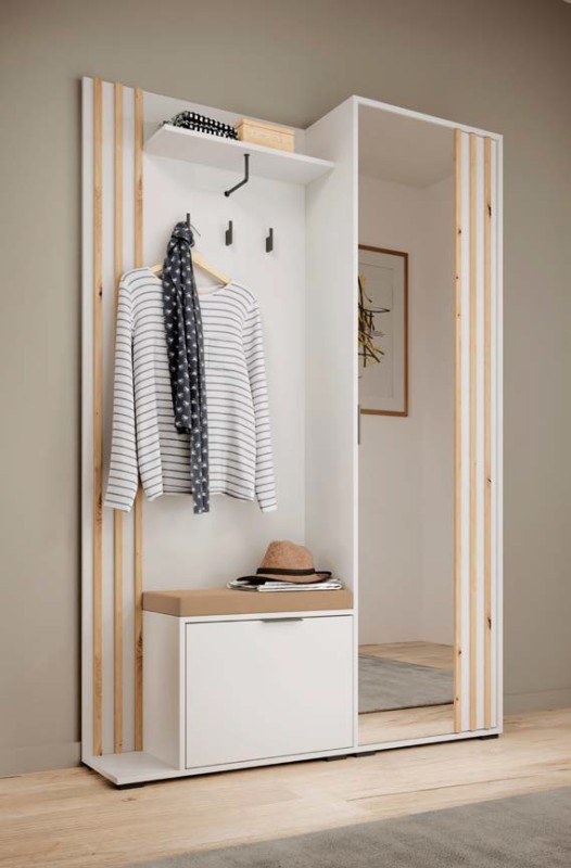 Funkcjonalny układ obejmuje praktyczny panel z wieszakami, półkę na dodatki oraz wygodne siedzisko z miejscem do przechowywania. Całość uzupełnia wysokie lustro, optycznie powiększające przestrzeń oraz mini szafą wewnątrz.