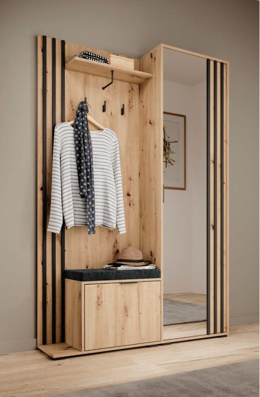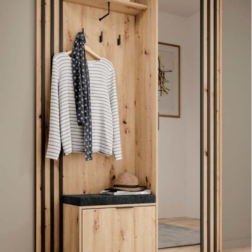 Funkcjonalny układ obejmuje praktyczny panel z wieszakami, półkę na dodatki oraz wygodne siedzisko z miejscem do przechowywania. Całość uzupełnia wysokie lustro, optycznie powiększające przestrzeń oraz mini szafą wewnątrz.
