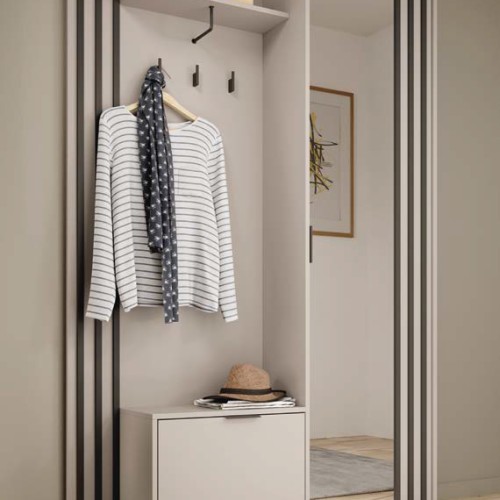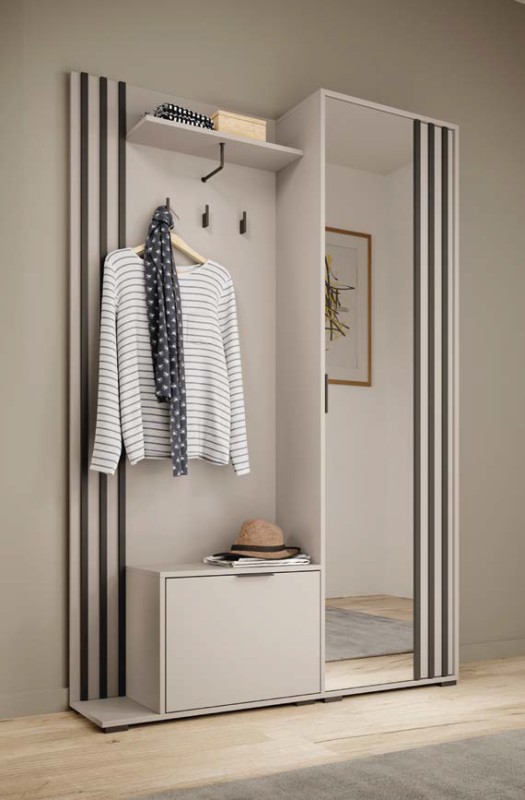 Funkcjonalny układ obejmuje praktyczny panel z wieszakami, półkę na dodatki oraz wygodne siedzisko z miejscem do przechowywania. Całość uzupełnia wysokie lustro, optycznie powiększające przestrzeń oraz mini szafą wewnątrz.