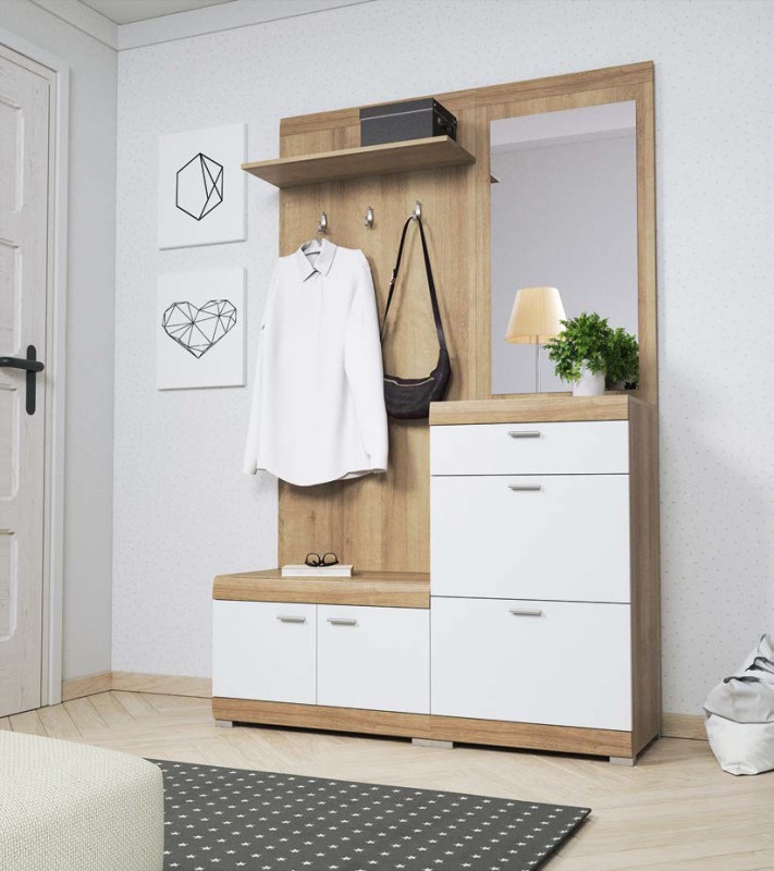 Garderoba została wyposażona w panel z wieszakami, pókę, duże lustro, siedzisko oraz pojemne szafki. Dodatkowo komoda z szufladą i szafką zwiększa funkcjonalność oferując jeszcze więcej miejsc do przechowywania.