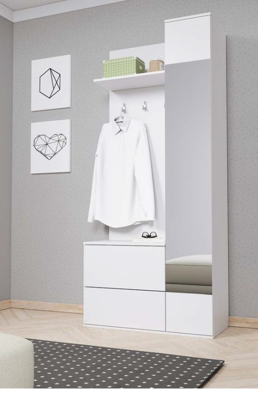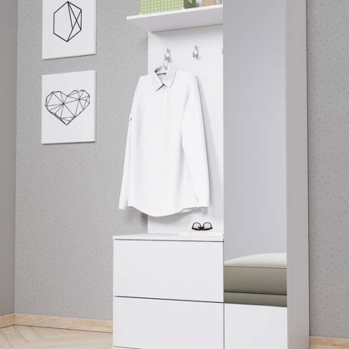 GARDEROBA GREEN to typowy model garderoby do mniejszych pomieszczeń. Garderoba posiada półkę, szafkę oraz duże lustro z ukryta mini szafą.