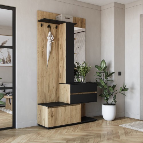 Garderoba została wyposażona w panel z wieszakami, półkę, lustro oraz pojemne, ozdobne szafki. Dodatkowo komoda z szufladą i szafką zwiększa funkcjonalność oferując jeszcze więcej miejsc do przechowywania.