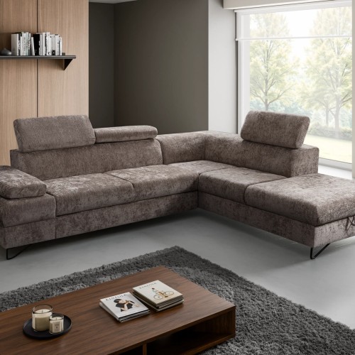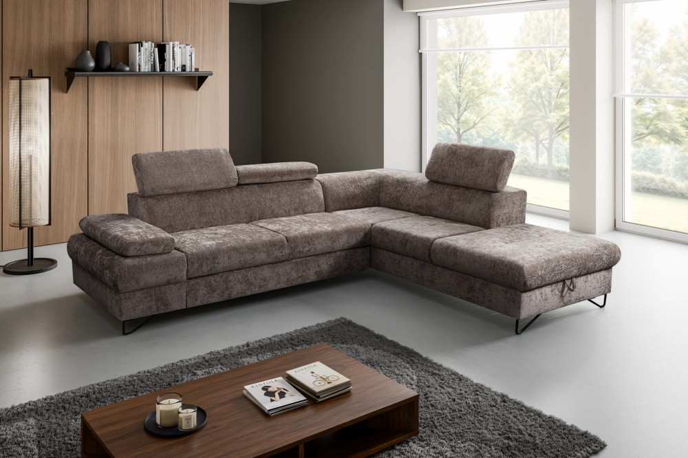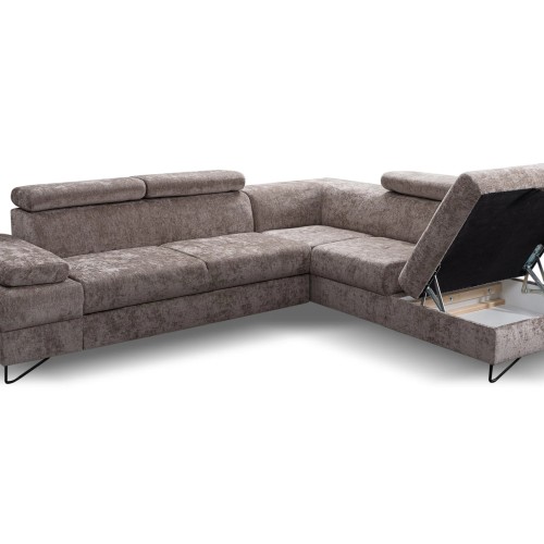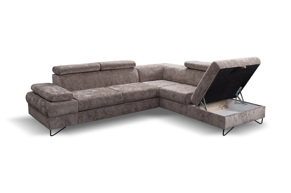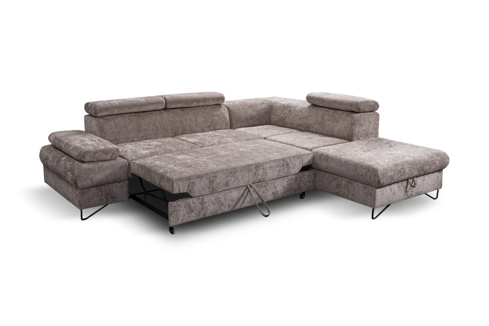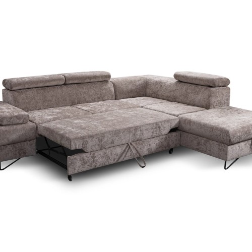 NAROŻNIK FLAVO posiada regulowane zagłówki oraz podłokietniki, funkcje spania oraz pojemnik na pościel.