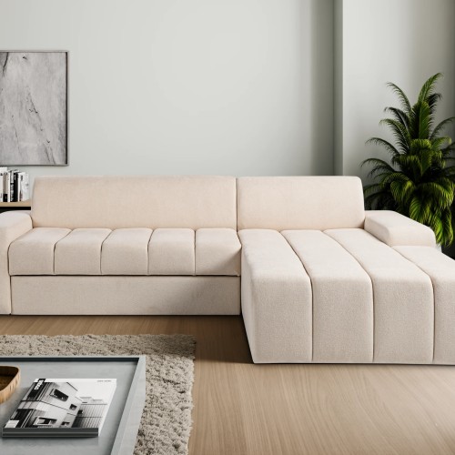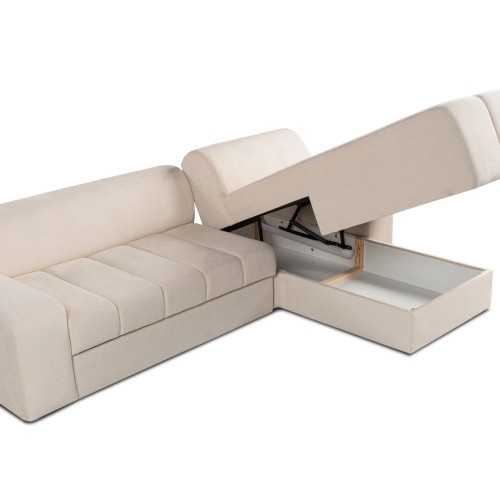 NAROŻNIK LUMI posiada regulowane zagłówki, funkcje spania oraz pojemnik na pościel.