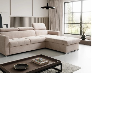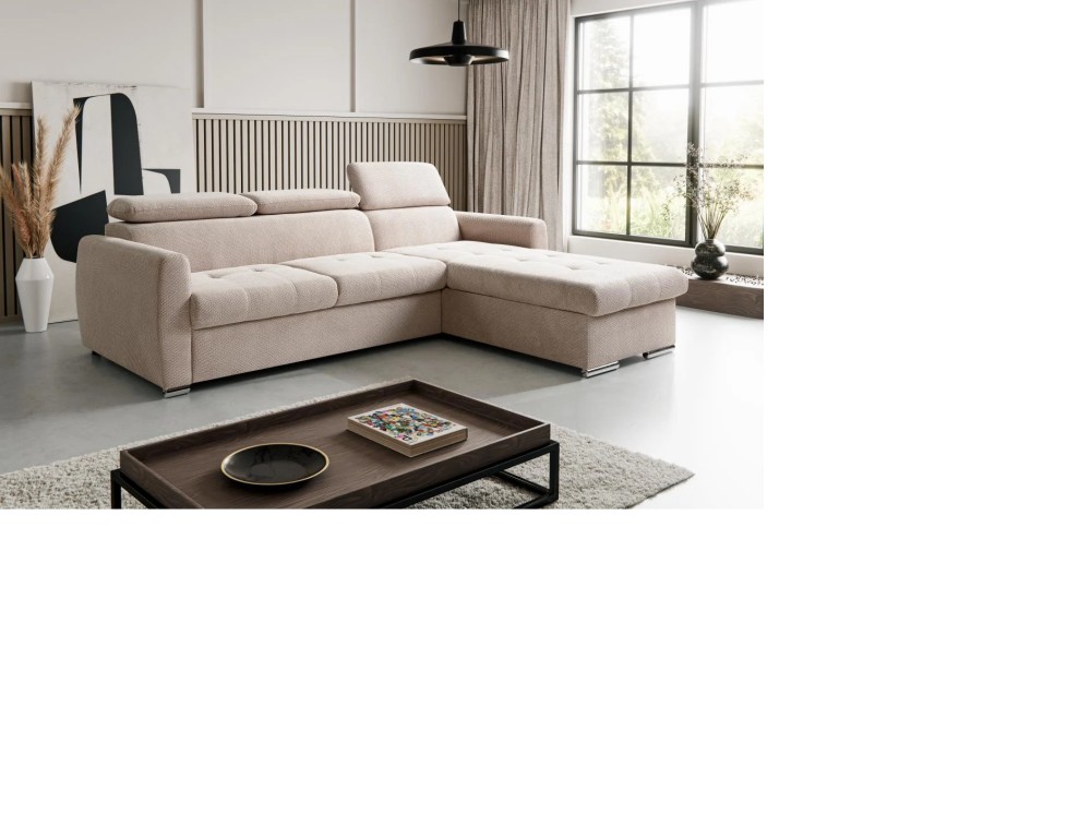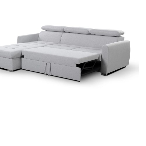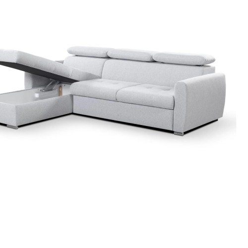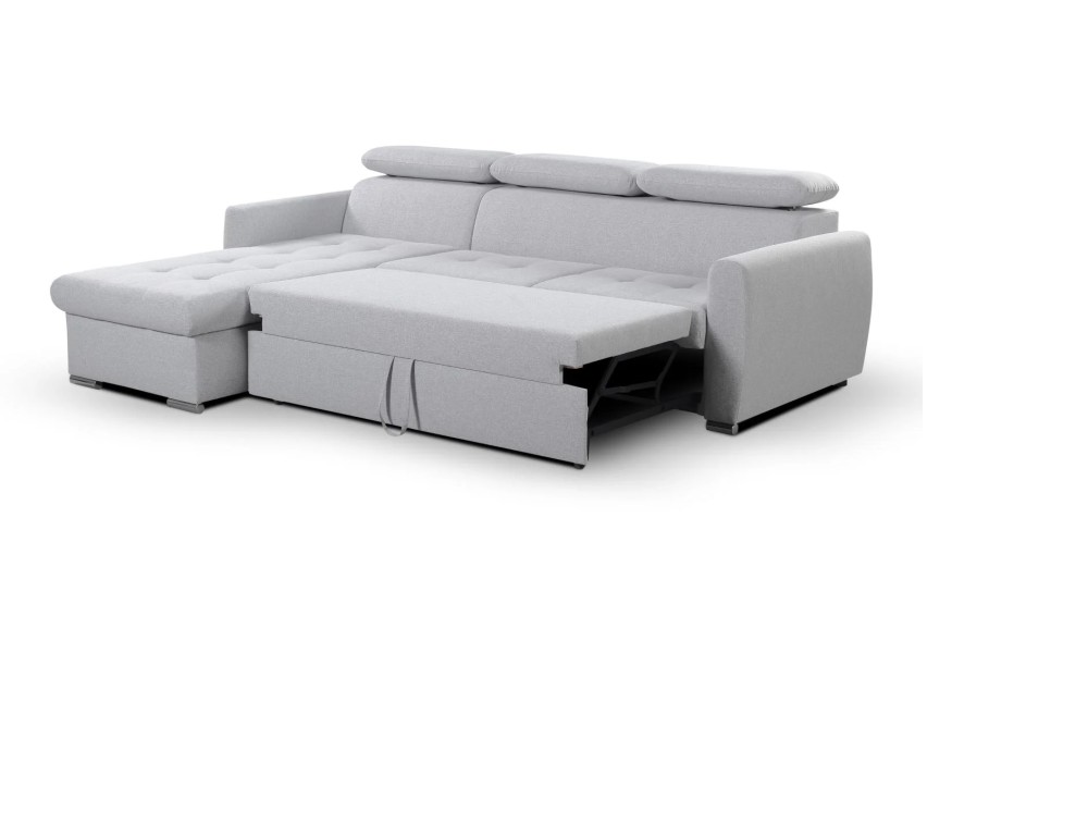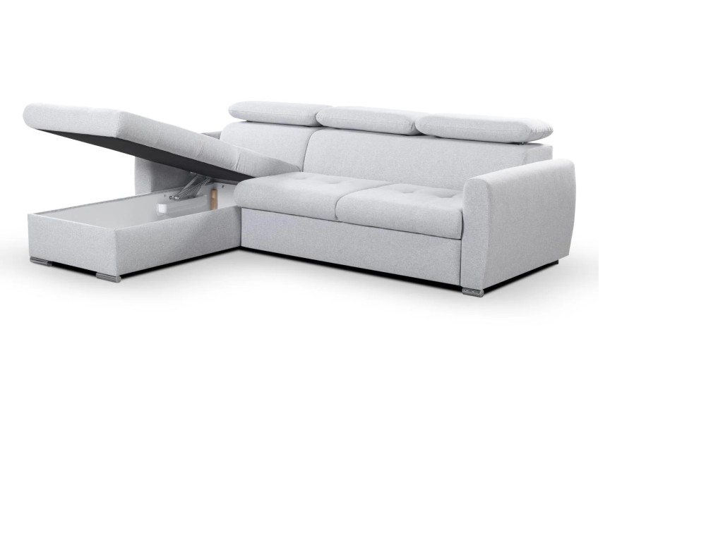 NAROŻNIK PEDRO MINI posiada regulowane zagłówki, funkcje spania oraz pojemnik na pościel.
