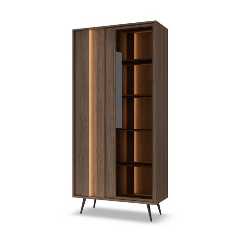 Witryna AMARO to stylowy, oryginalny mebel o wyrazistym, nowoczesnym charakterze. Ciemna kolorystyka drewna, połączona z dekoracyjnymi, pionowymi wstawkami na frontach i subtelnym podświetleniem, dodaje elegancji i wyjątkowej głębi.