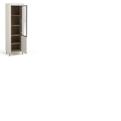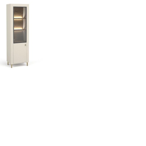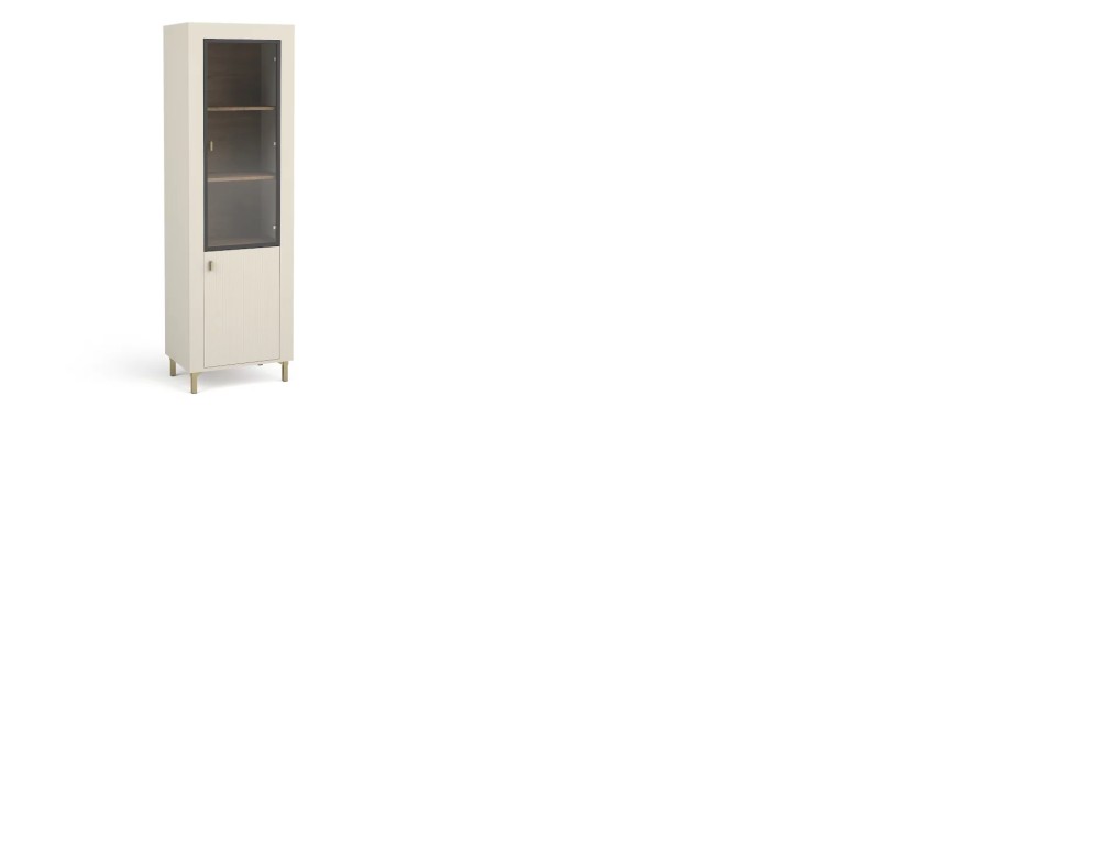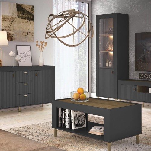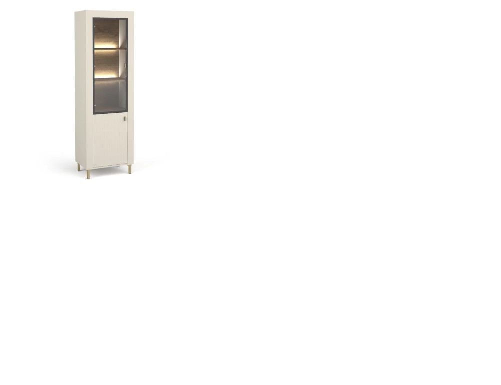Witryna stojąca Mossa – Nowoczesny regał w modnej kolorystyce. Niewątpliwie największą zaletą bryły jest duża pakowność. Mebel posiada dwa fronty, jeden przeszklony w górnej części za którym znajdują się trzy przestrzenie ( półki z płyty wiórowej). Ponadto w dolnej części znajduje się szafka z pełnym frontem za którym mamy dwie przestrzenie. Dodatkowo można dokupić oświetlenie.