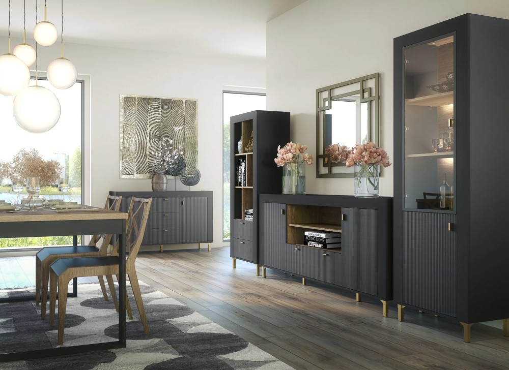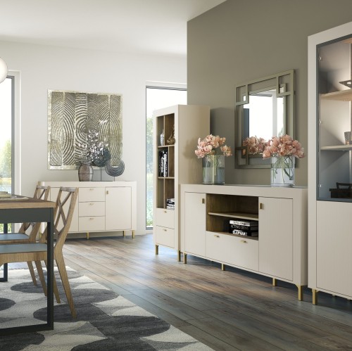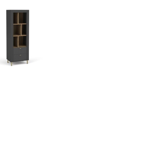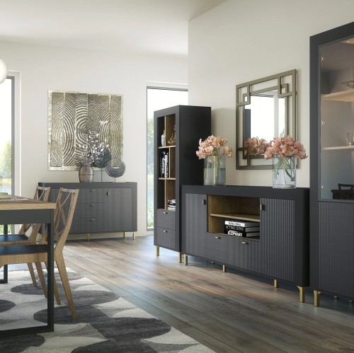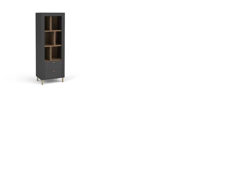 Regał niski MOSSA z wnętrzem w kolorze Dąb Whisky pozwala na uporządkowanie rzeczy i drobiazgów niezbędnych w każdym domu. W środku znajdują się półki. Regał posiada dwie szuflady ze złotymi uchwytami oraz nóżki o wysokości 12 cm. Jego elegancki i nowoczesny design oraz funkcjonalność idealnie uzupełni wnętrze każdego pomieszczenia.