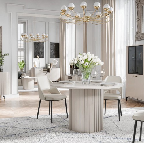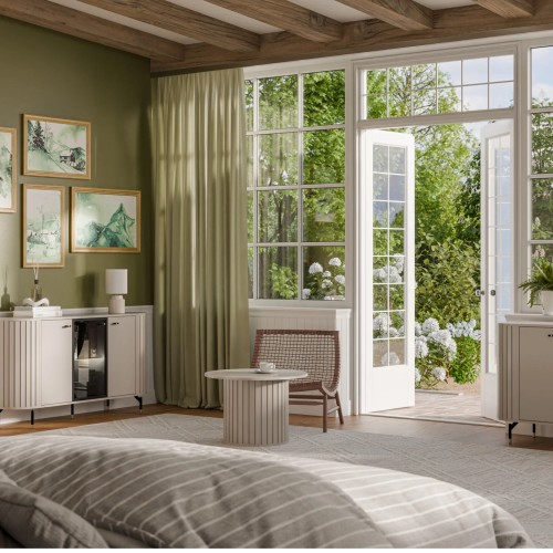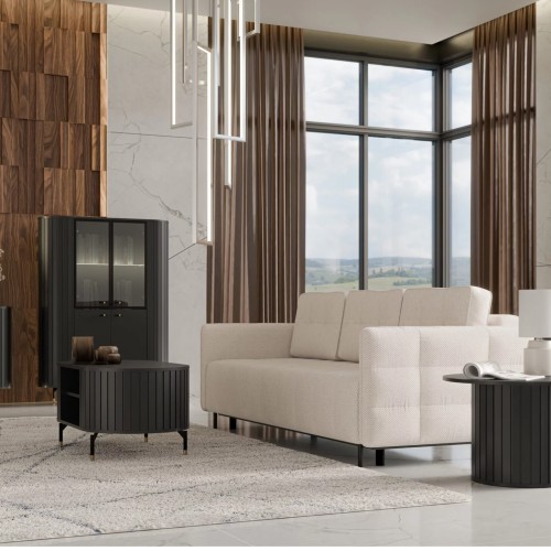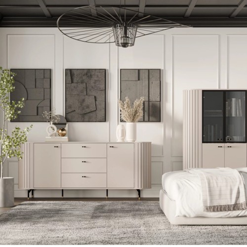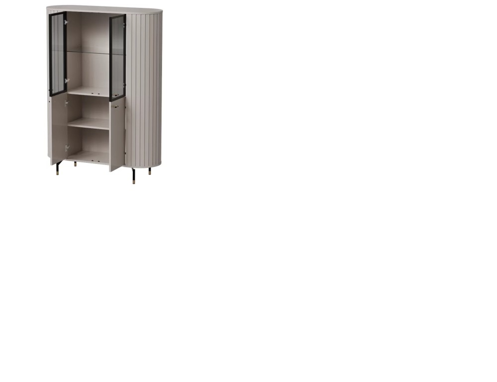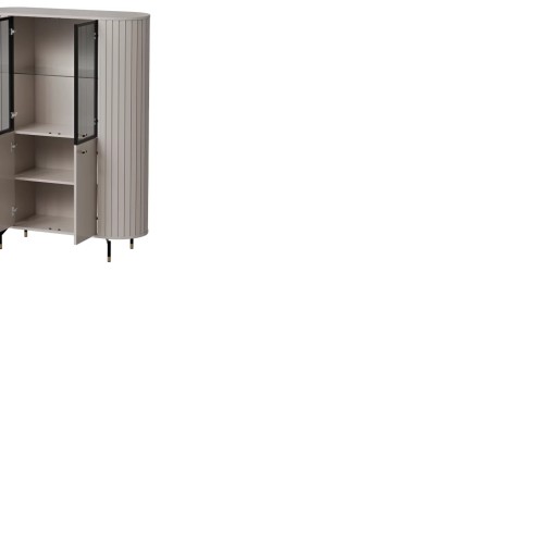 Witryna ZANTE ZA1 w delikatnym odcieniu cashmere to propozycja dla miłośników jasnych, harmonijnych wnętrz. Zaokrąglone, ryflowane boki i szklane fronty dodają jej subtelnej elegancji, a stonowana kolorystyka wprowadza do pomieszczenia lekkość i spokój. To mebel, który nie tylko pięknie eksponuje, ale też dyskretnie porządkuje przestrzeń.