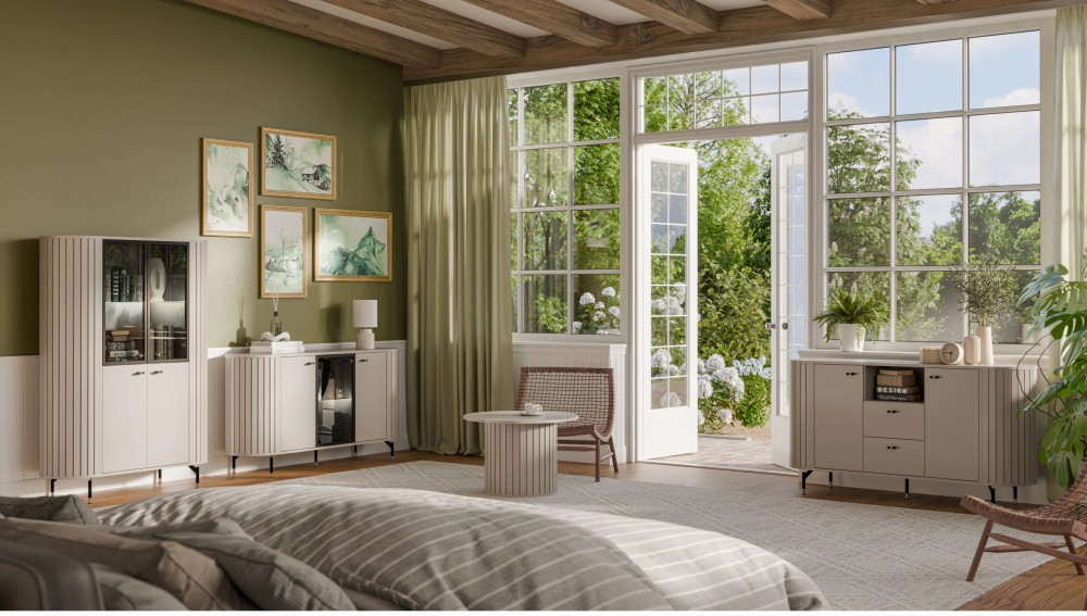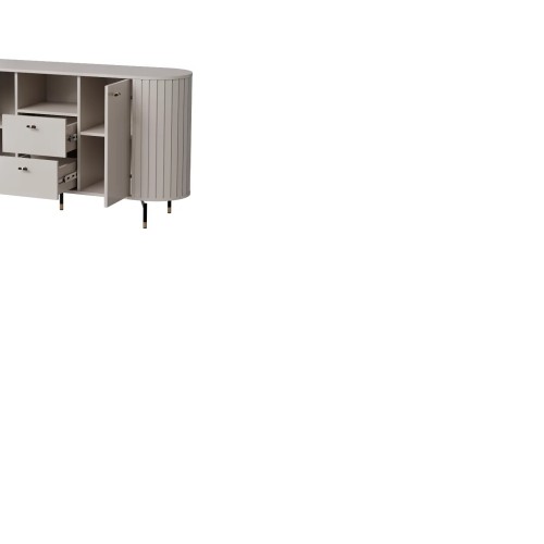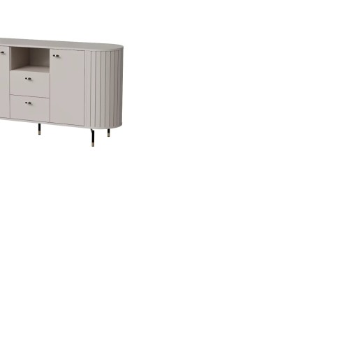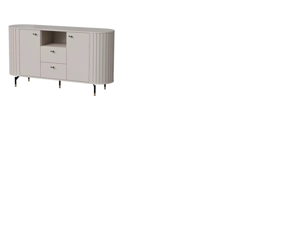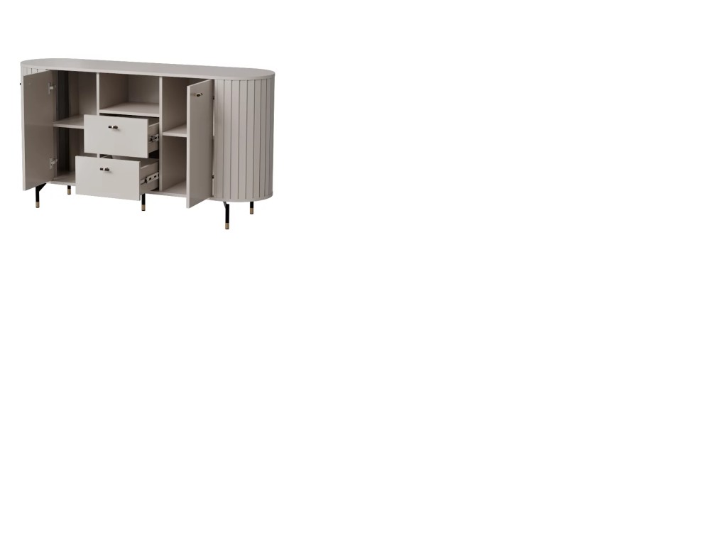 KOMODA ZANTE ZA2 – sprawdzi się doskonale w salonie, biurze czy pokoju dziennym. Istotnie cechą wyróżniającą kolekcję są zaokrąglone boki mebli, które zostały wykonane z listewek z MDF łączonych ze sobą za pomocą wpustu. Ponadto każda listewka połączona jest z górnym i dolnym blatem za pomocą kołka co uniemożliwia wypadniecie listewek. Bez wątpienia mebel w zestawieniu z innymi elementami systemu tworzy niecodzienną kompozycje. Dodatkowo uroku całej kompozycji dodają czarno-złote, subtelne nóżki. Z pewnością system Zante zachwyca swoją elegancją oraz oryginalnością.