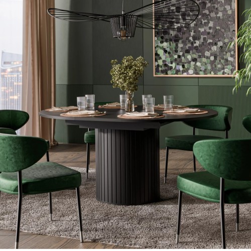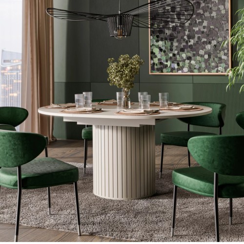 Stół z lamelami rozkładany ZANTE ZA9 – sprawdzi się doskonale w salonie jadalni czy pokoju dziennym. Istotnie cechą wyróżniającą kolekcji są zaokrąglone boki mebli, które zostały wykonane z listewek z MDF łączonych ze sobą za pomocą wpustu. W stole okrągłe listewki tworzą podstawę pod blat. Ponadto każda listewka połączona jest z górnym blatem za pomocą kołka co uniemożliwia wypadniecie listewek. Z pewnością zaleta mebla jest opcja rozkładnia. Bez wątpienia mebel w zestawieniu z innymi elementami systemu tworzy niecodzienną kompozycje. Dodatkowo uroku całej kompozycji dodają czarno-złote, subtelne nóżki. Z pewnością system Zante zachwyca swoją elegancją oraz oryginalnością.