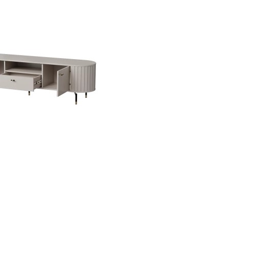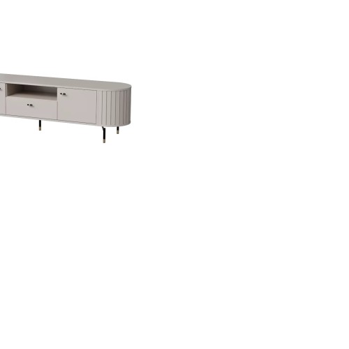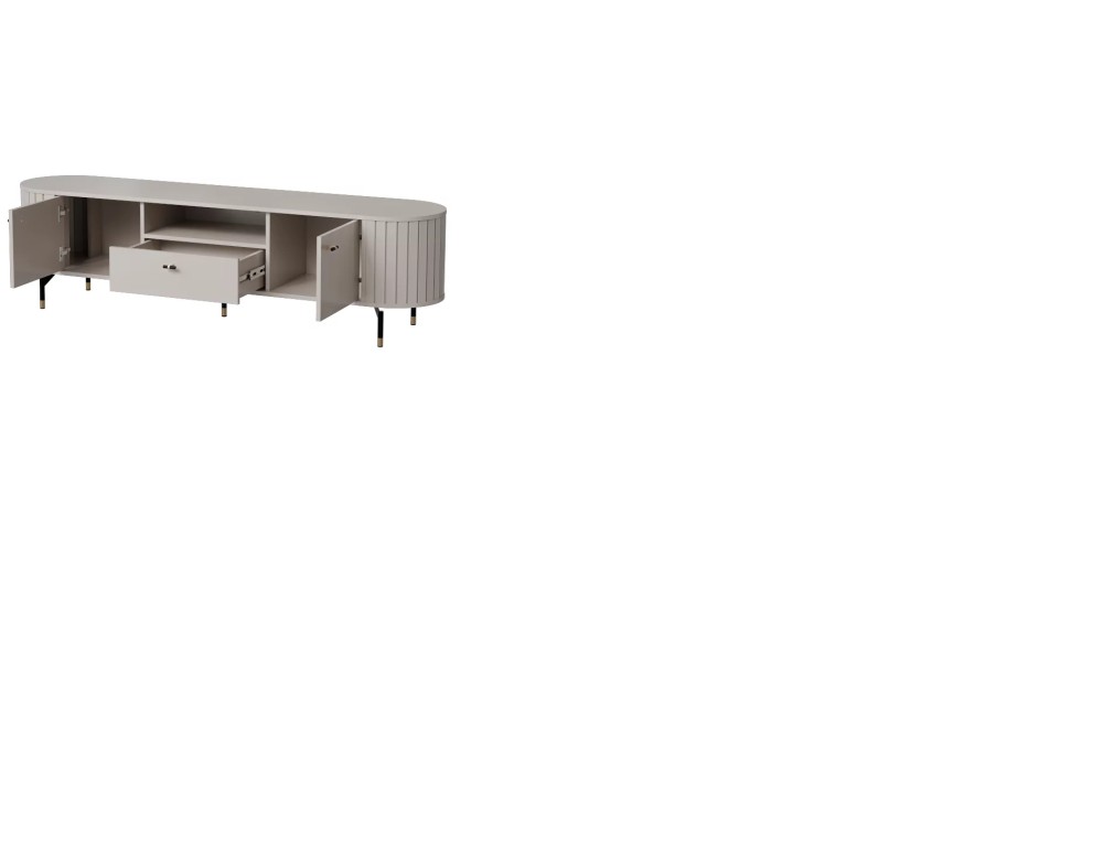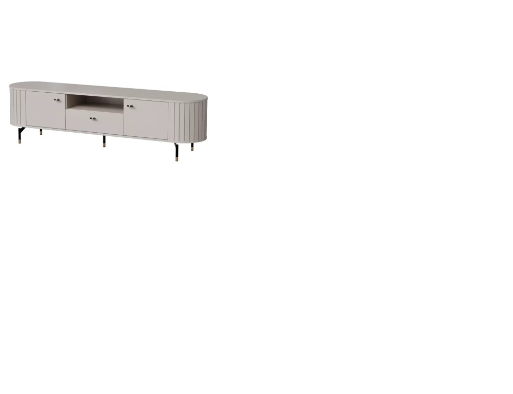 Nowoczesna szafka rtv 180 komoda pod telewizor okrągłe boki kaszmir ZANTE ZA5 – sprawdzi się doskonale w salonie, biurze czy pokoju dziennym. Istotnie cechą wyróżniającą kolekcję są zaokrąglone boki mebli, które zostały wykonane z listewek z MDF łączonych ze sobą za pomocą wpustu. Ponadto każda listewka połączona jest z górnym i dolnym blatem za pomocą kołka co uniemożliwia wypadniecie listewek. Bez wątpienia mebel w zestawieniu z innymi elementami systemu tworzy niecodzienną kompozycje. Dodatkowo uroku całej kompozycji dodają czarno-złote, subtelne nóżki. Z pewnością system Zante zachwyca swoją elegancją oraz oryginalnością.