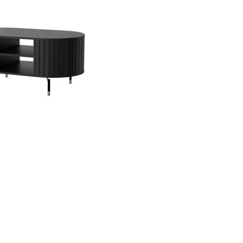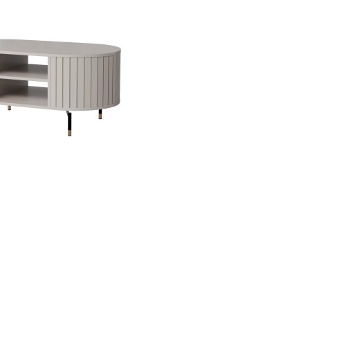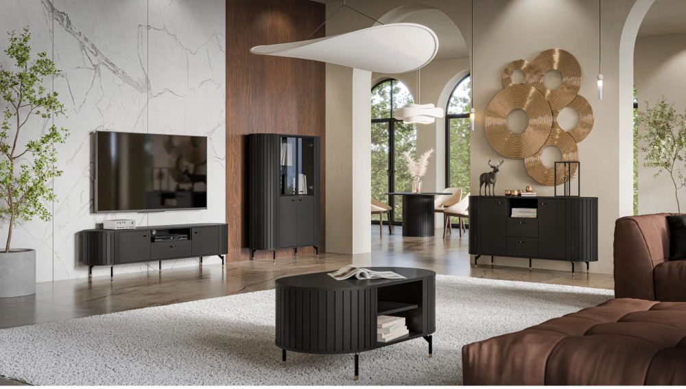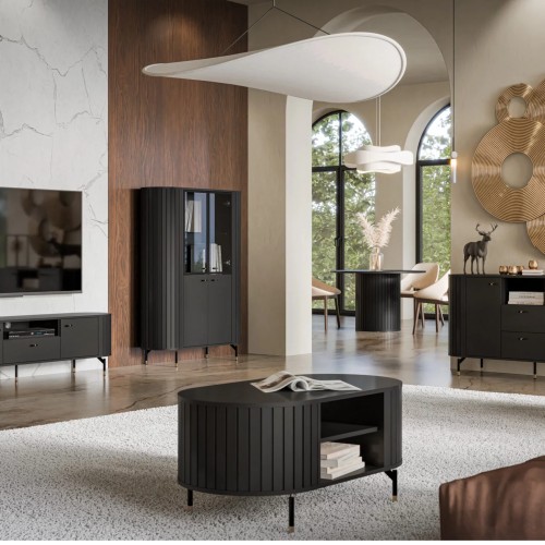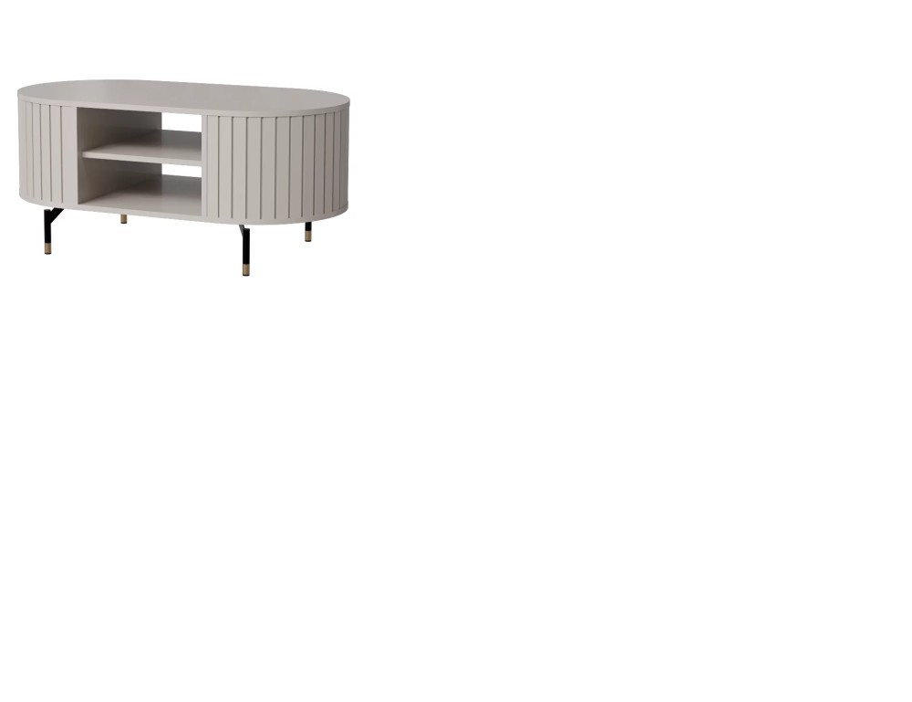 Nowoczesny stolik kawowy ława do salonu okrągłe boki kaszmir ZANTE ZA6 – sprawdzi się doskonale w salonie, biurze czy pokoju dziennym. Istotnie cechą wyróżniającą kolekcję są zaokrąglone boki mebli, które zostały wykonane z listewek z MDF łączonych ze sobą za pomocą wpustu. Ponadto każda listewka połączona jest z górnym i dolnym blatem za pomocą kołka co uniemożliwia wypadniecie listewek. Bez wątpienia mebel w zestawieniu z innymi elementami systemu tworzy niecodzienną kompozycje. Dodatkowo uroku całej kompozycji dodają czarno-złote, subtelne nóżki. Z pewnością system Zante zachwyca swoją elegancją oraz oryginalnością.