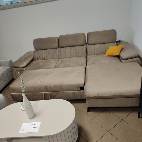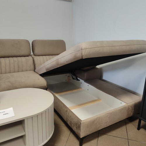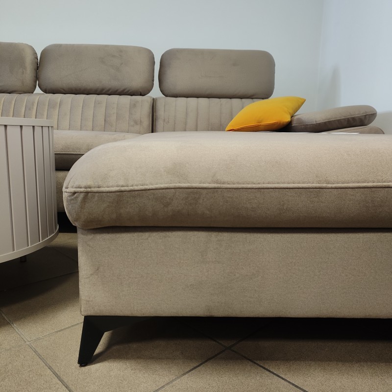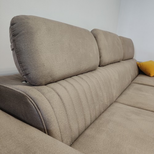 Narożnik Belt wykonany został z wysokiej jakości materiałów produkcyjnych co gwarantuje jego wieloletnie i niezmienne w formie użytkowanie. Zestaw posiada zdobione pionowymi przeszyciami profilowane oparcie. Wygodny, stylizowany podłokietnik wraz z regulowanymi zagłówkami dbają o komfort odpoczynku w czasie wieczornego oglądania ulubionych seriali. Całość spoczywa na wysokich, czarnych stópkach podkreślających elegancki charakter zestawu. Narożnik wyposażony został w funkcję spania typu Dlefin oraz umieszczony w otomanie pojemnik na pościel.