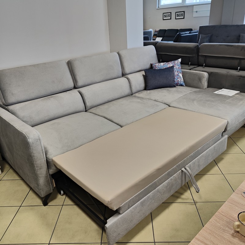 Posiada funkcje spania,pojemnik na pościel oraz regulowane zagłówki.